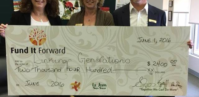 Linking Generations Executive Director Debbie Sinclair accepts a cheque for $2400 from Sherwood Park crowdfunding group Fund It Forward.
