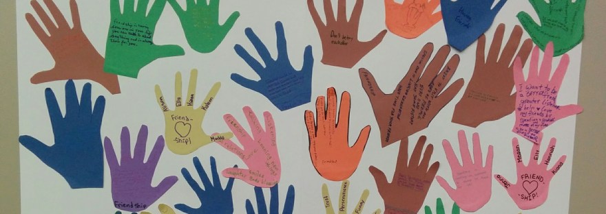 Each senior and student traced each of their hands and then cut their hands out. Each wrote something on each hand something about friendship on one hand and dreams on the other. These became Tree leaves.