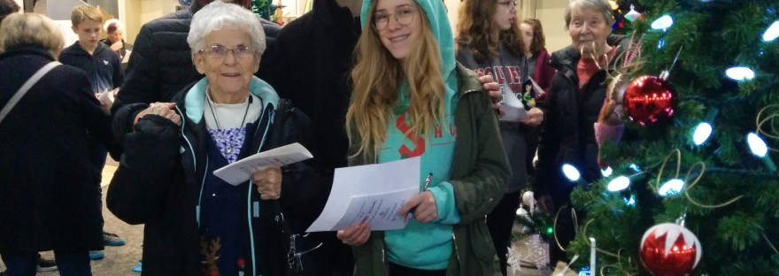 It was so exciting to bring together our seniors from Bedford Village and SilverBirch Manor/Lodge to meet their students from St. Theresa Catholic School and students from Lakeland Ridge Junior High and wander amongst the beautiful Christmas trees together. One senior even remarked “ What happened to the trees ‘we’ use to have.. covered with strings of popcorn?”. The Cultural Art Foundation allowed our students to have a small competation between the two schools and each school gathered on stage to sing carols for the seniors.