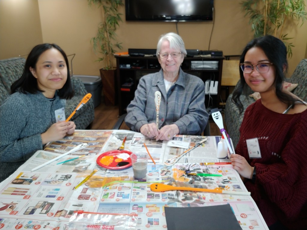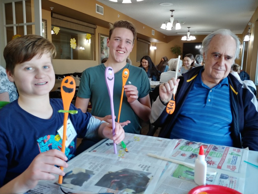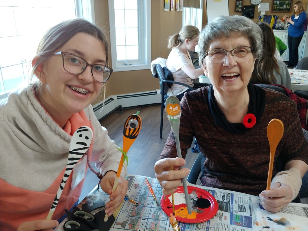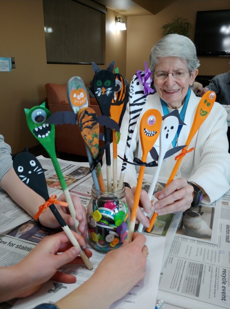 Students from Archbishop Jordan Catholic High School and Seniors from Chartwell Country Cottage Retirement Residence created Scary Wooden Spoons for Halloween. Did you know that the word “Halloween” comes from “All Hallows’ Eve” and means “hallowed evening.” Hundreds of years ago, people dressed up as saints and went door to door, which is the origin of Halloween costumes and trick-or-treating.