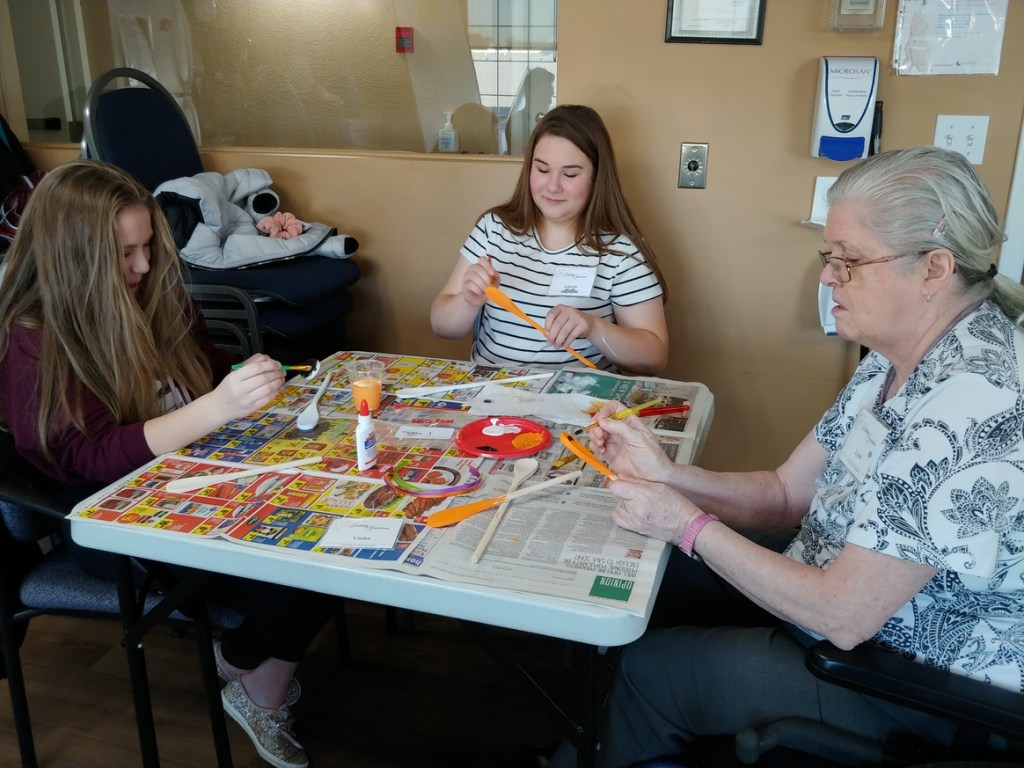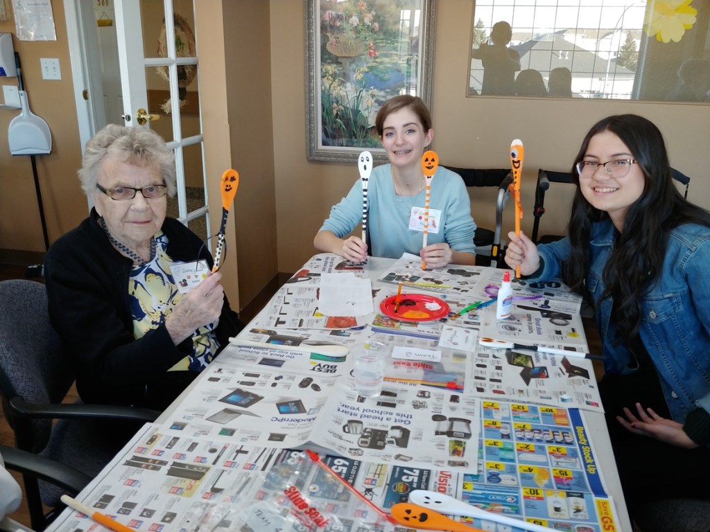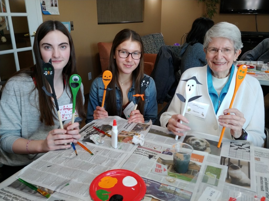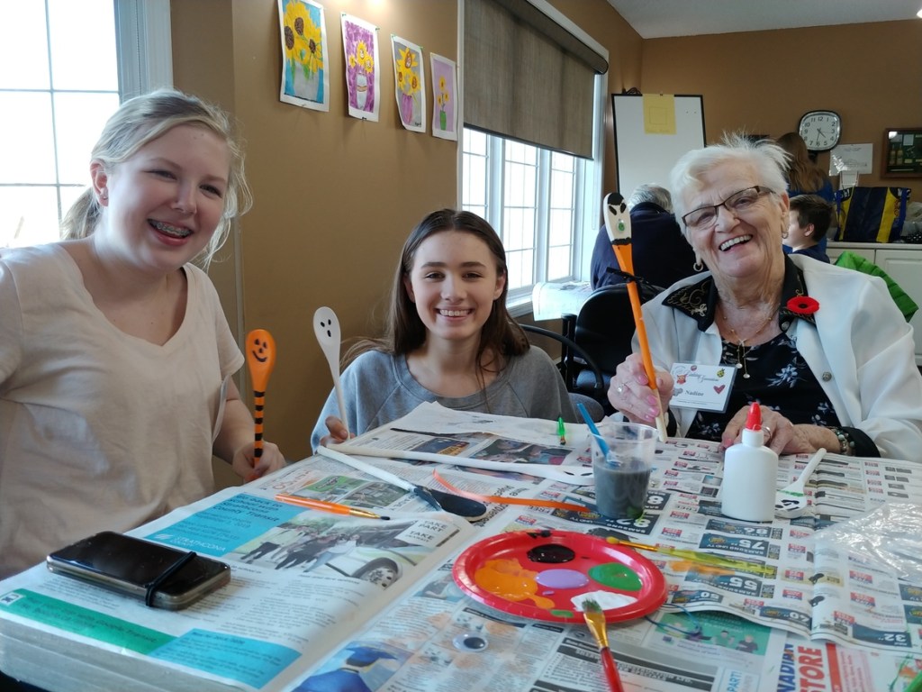 Students from Archbishop Jordan Catholic High School and Seniors from Chartwell Country Cottage Retirement Residence created Scary Wooden Spoons for Halloween. Did you know that the word “Halloween” comes from “All Hallows’ Eve” and means “hallowed evening.” Hundreds of years ago, people dressed up as saints and went door to door, which is the origin of Halloween costumes and trick-or-treating.