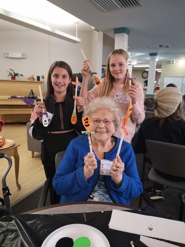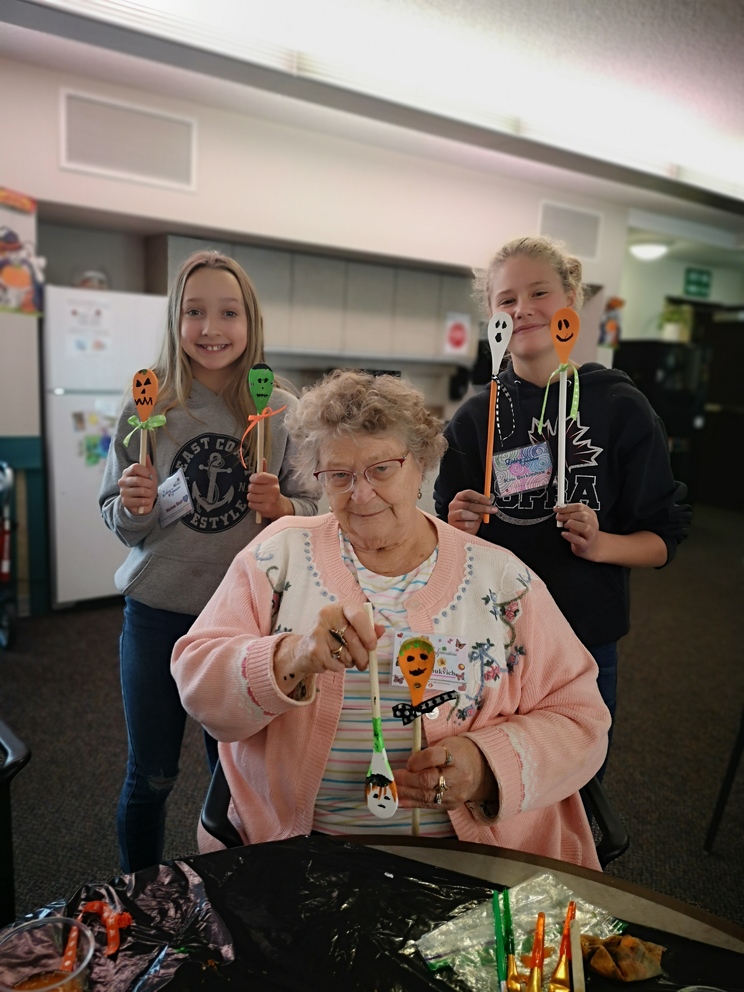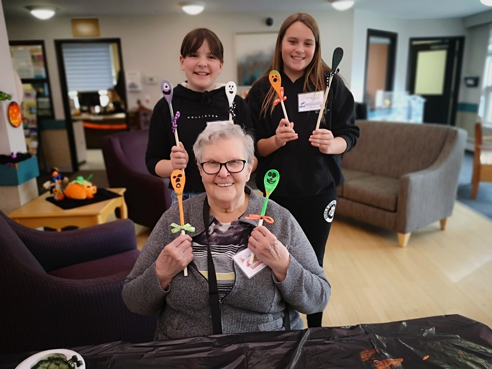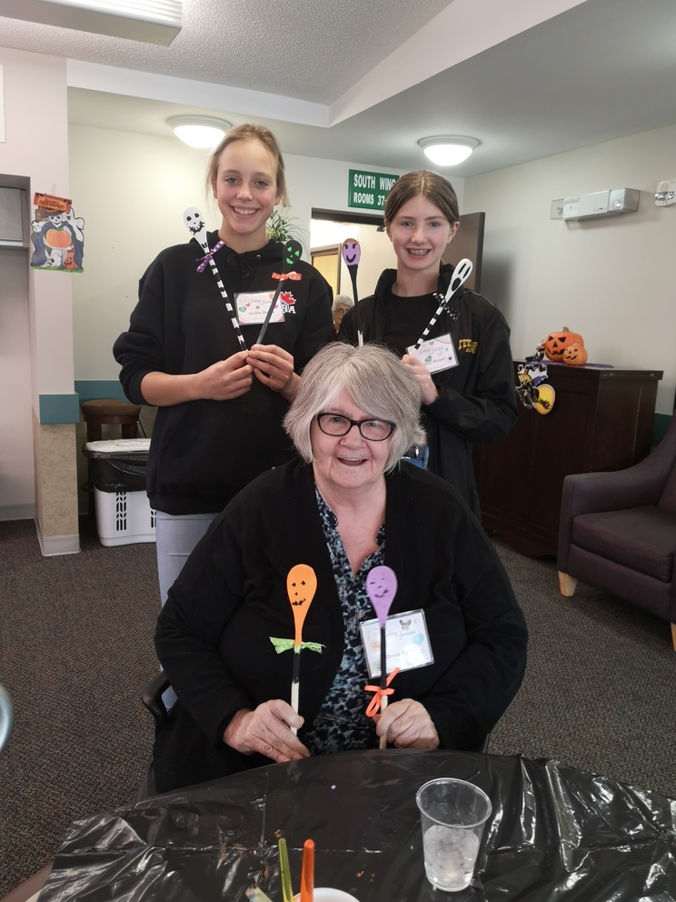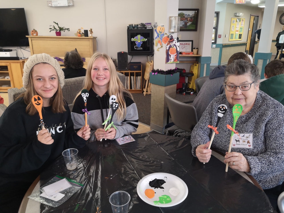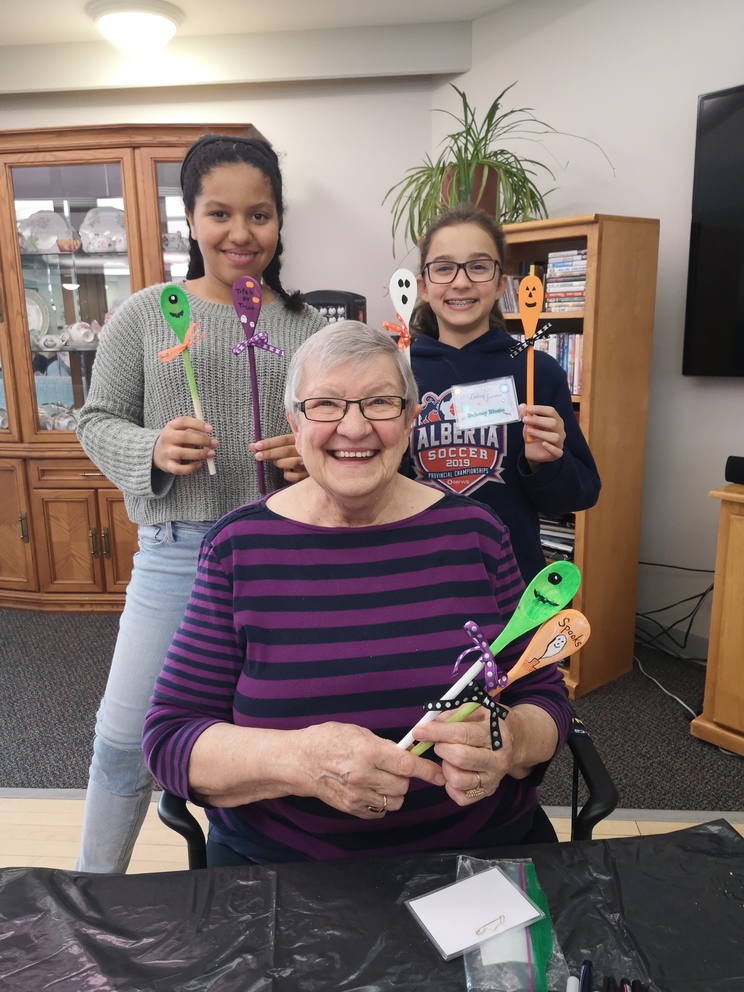 Students from École Our Lady of Perpetual Help Catholic School and Seniors from Clover Bar Lodge created Scary Wooden Spoons for Halloween. Did you know that the word “Halloween” comes from “All Hallows’ Eve” and means “hallowed evening.” Hundreds of years ago, people dressed up as saints and went door to door, which is the origin of Halloween costumes and trick-or-treating