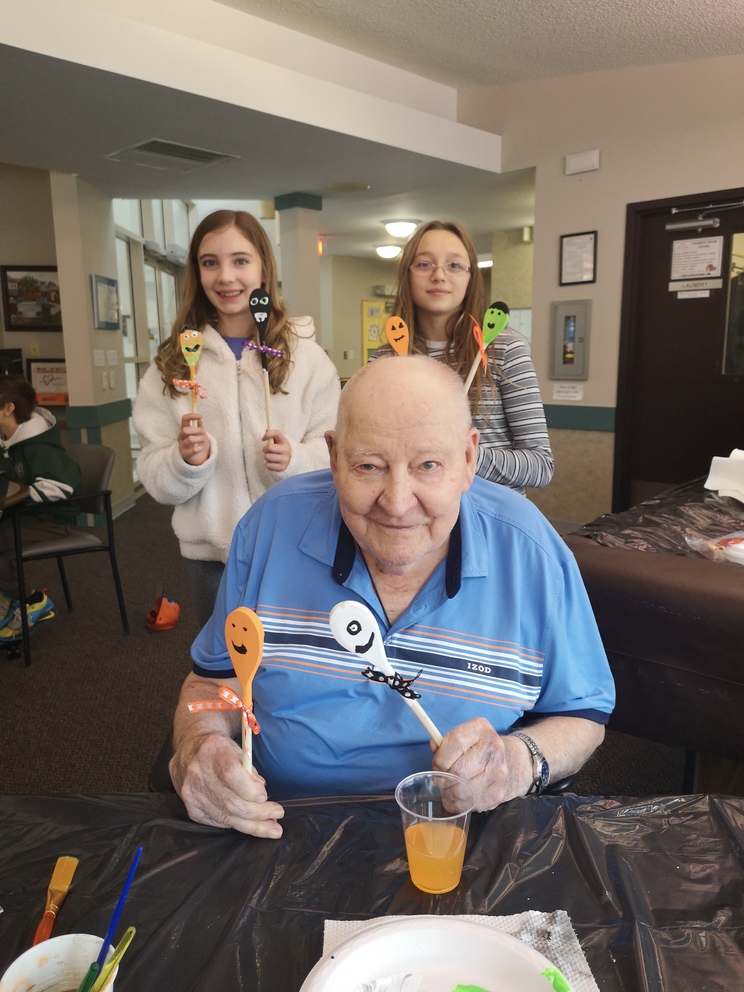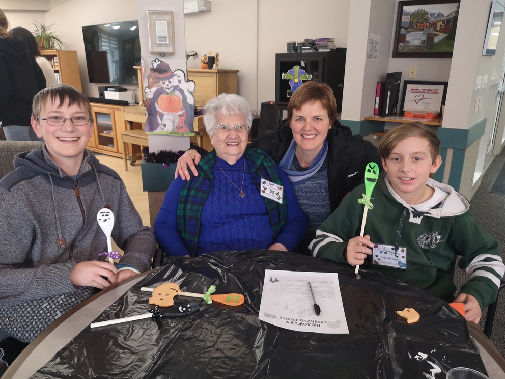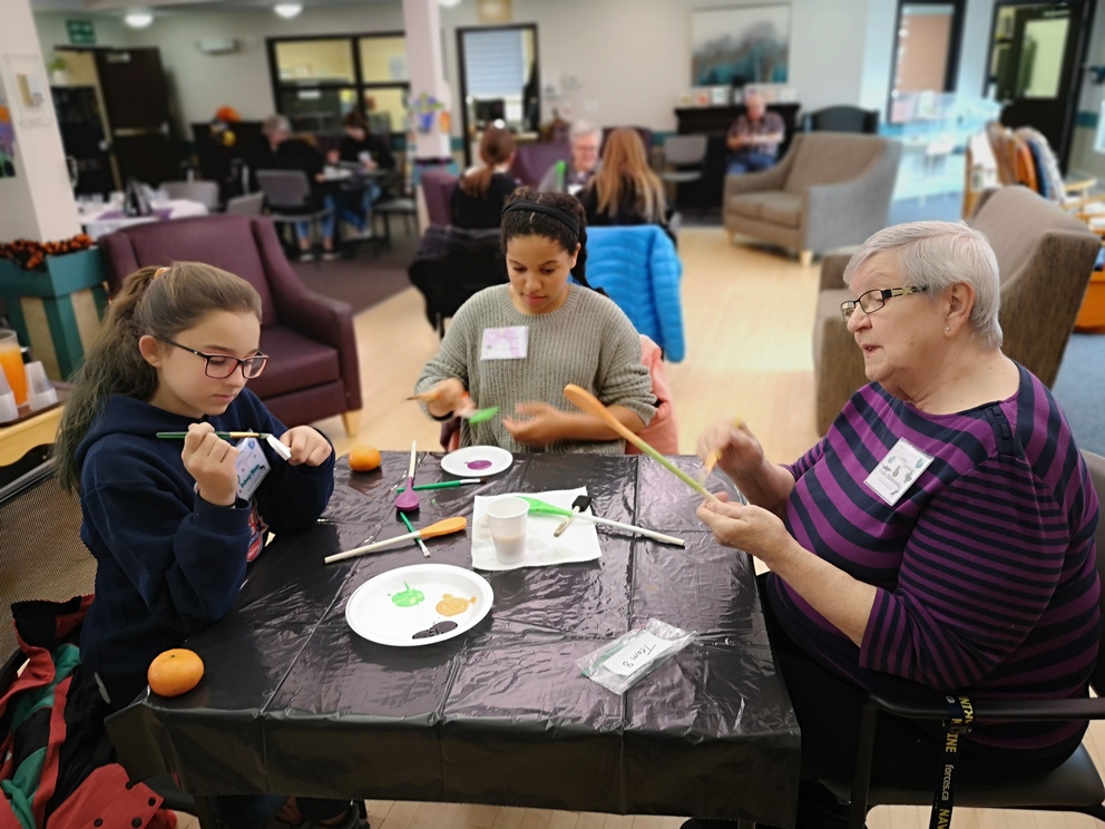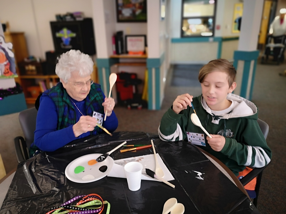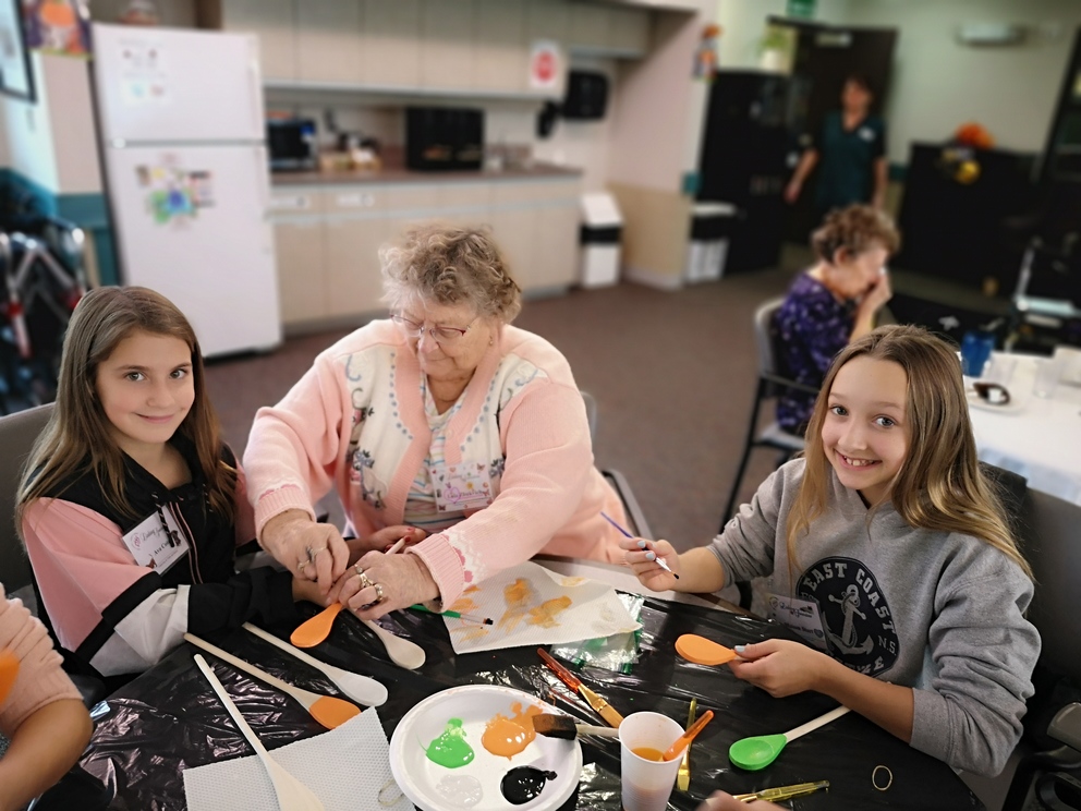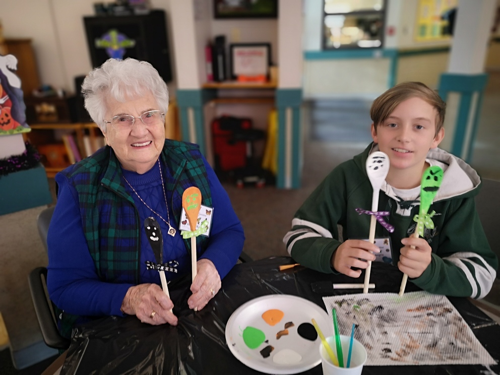 Students from École Our Lady of Perpetual Help Catholic School and Seniors from Clover Bar Lodge created Scary Wooden Spoons for Halloween. Did you know that the word “Halloween” comes from “All Hallows’ Eve” and means “hallowed evening.” Hundreds of years ago, people dressed up as saints and went door to door, which is the origin of Halloween costumes and trick-or-treating
