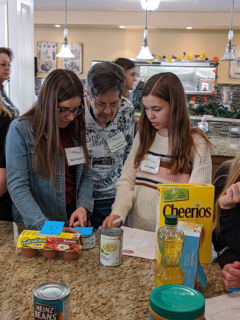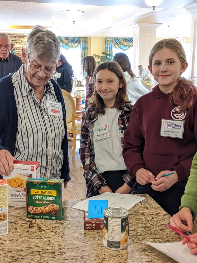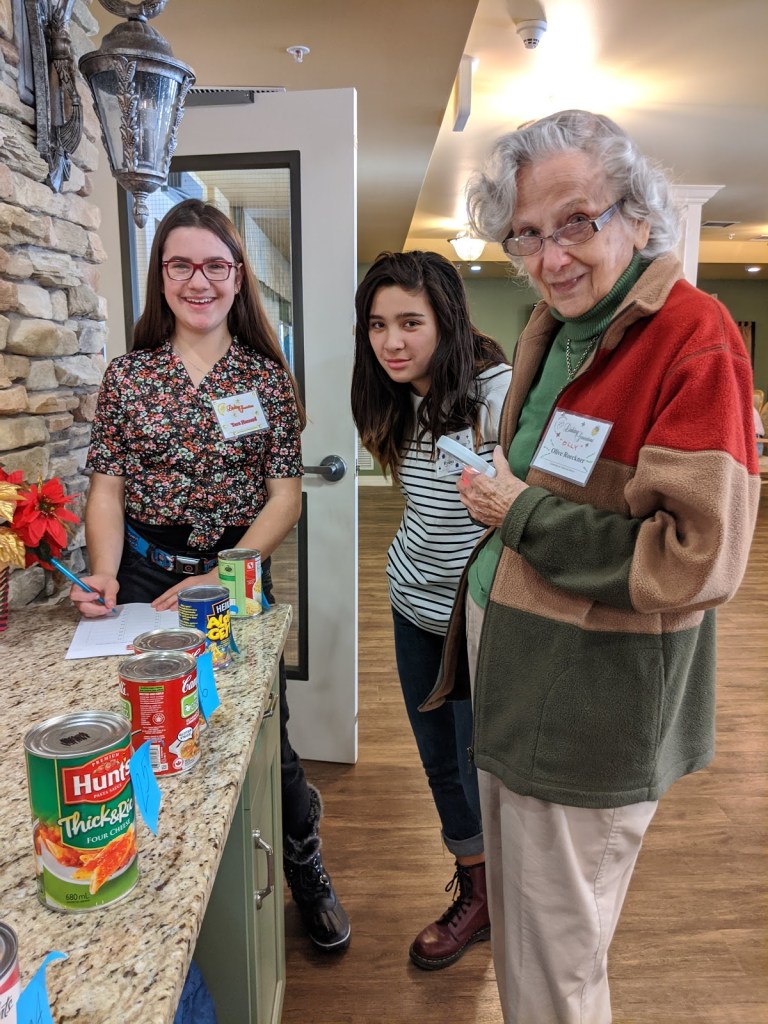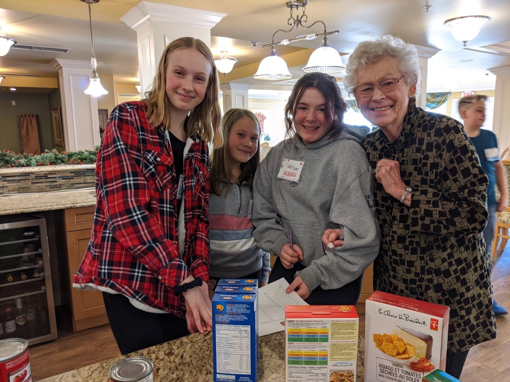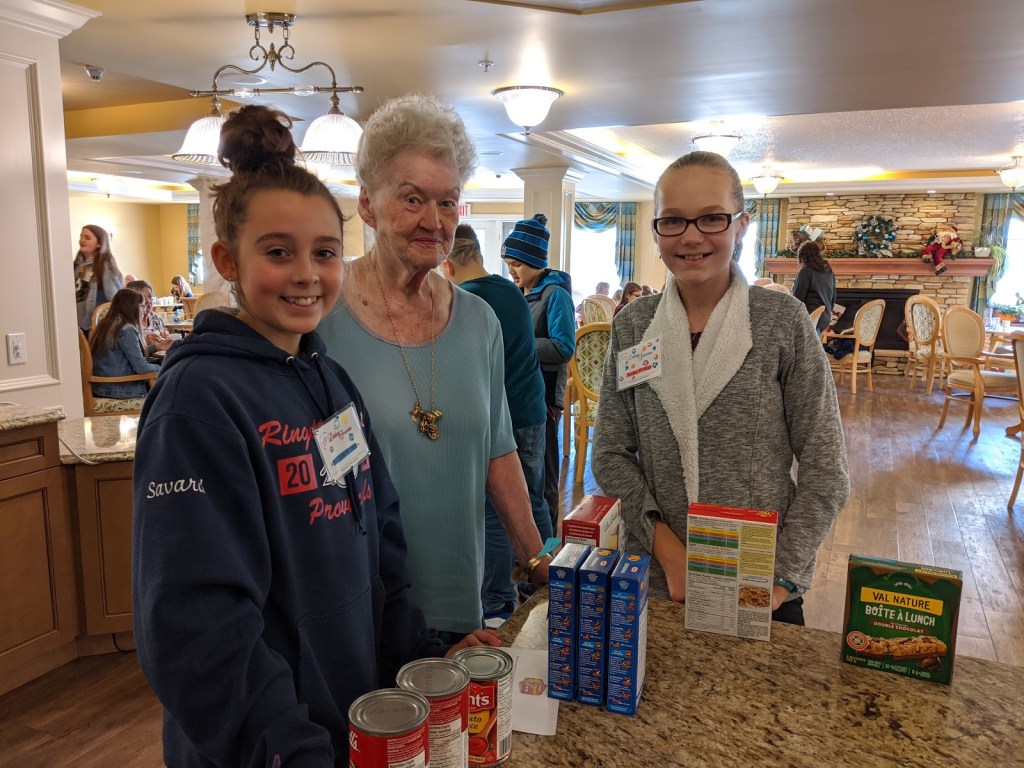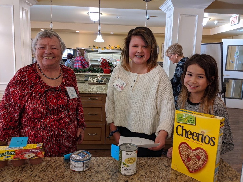 When all of our programs have completed these visits, all of our food items will be dropped off in time for Food Bank volunteers to add these to Christmas hampers.Pictured here are students from St. Theresa Middle School and their linked seniors from Bedford Village.