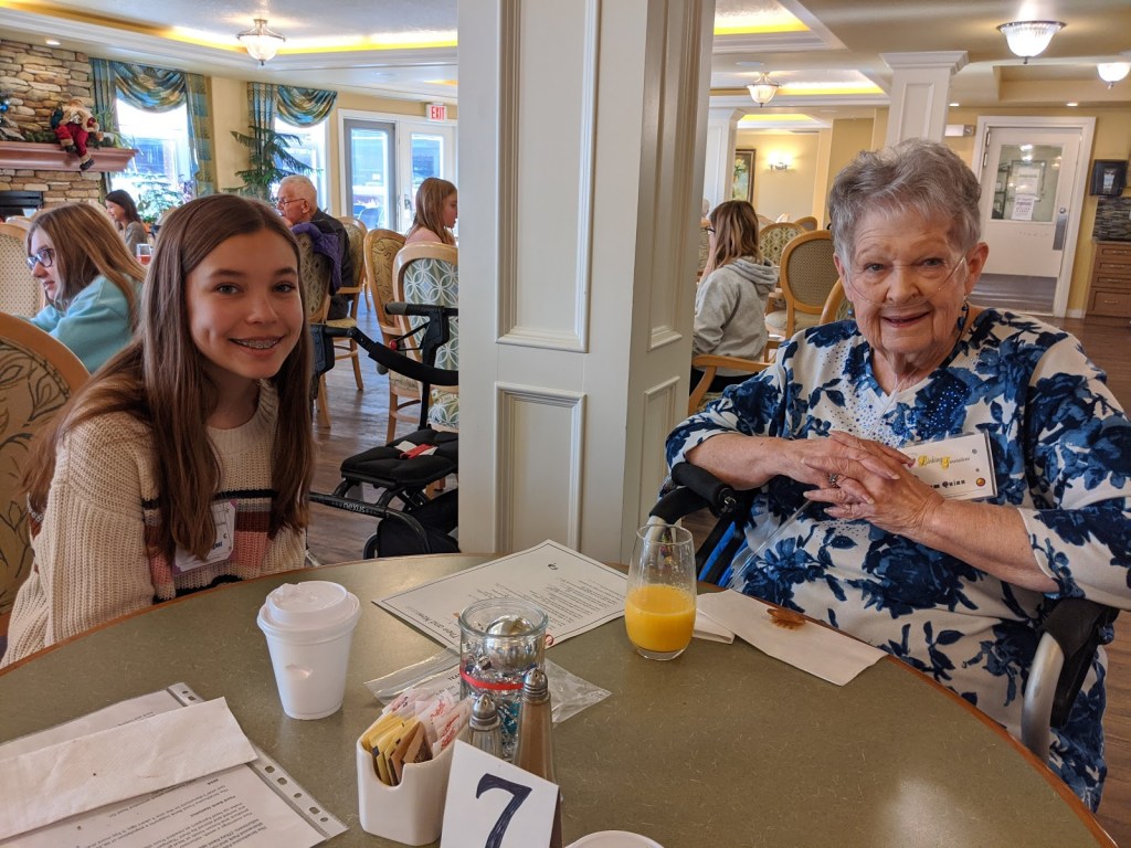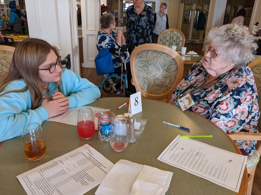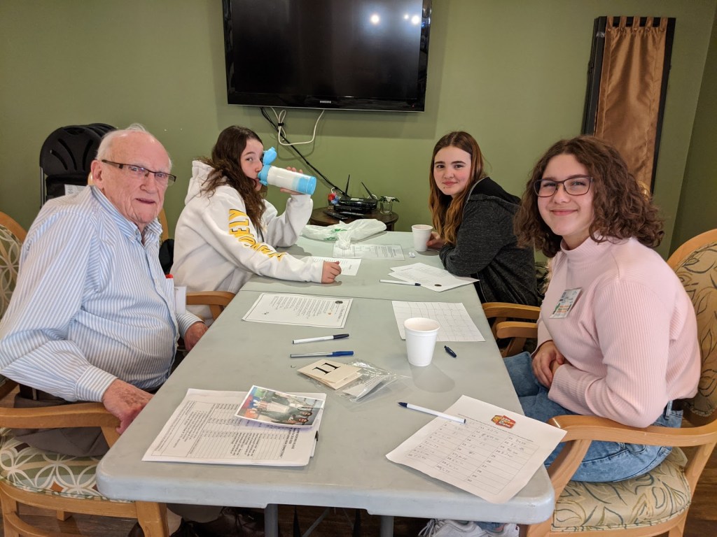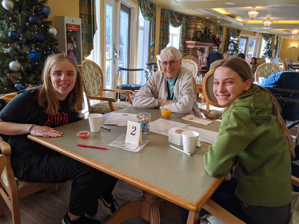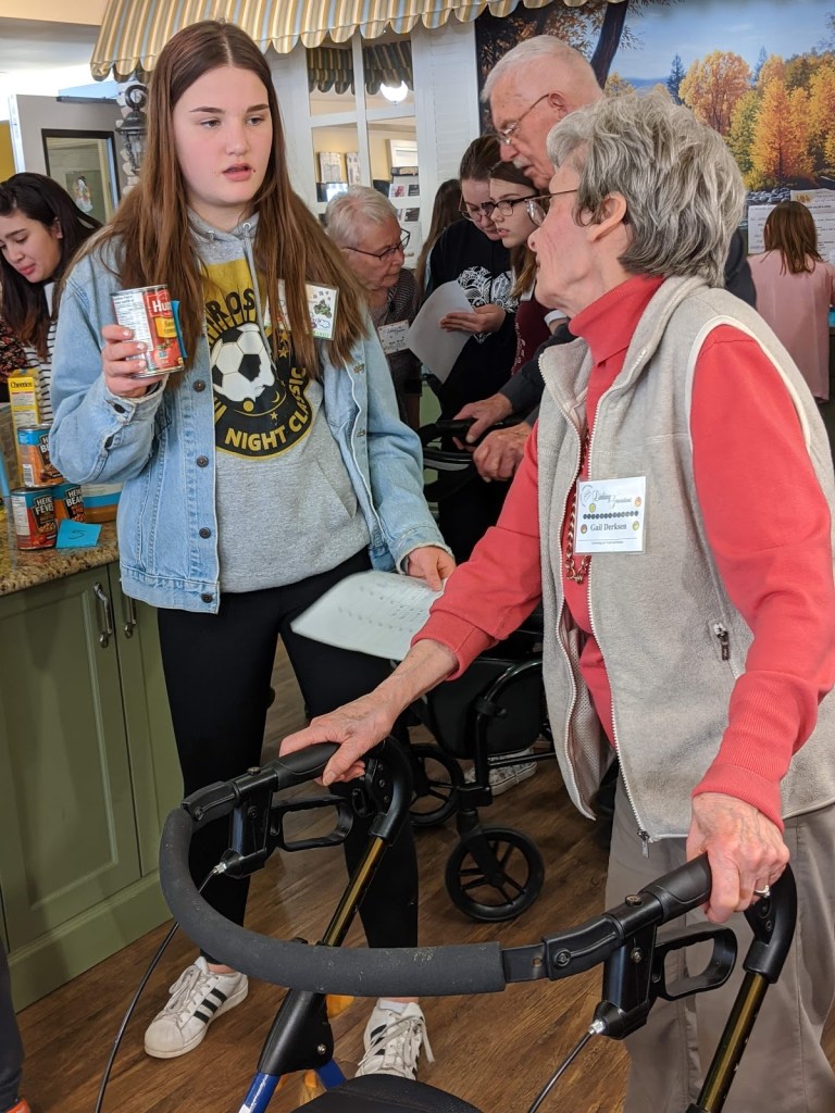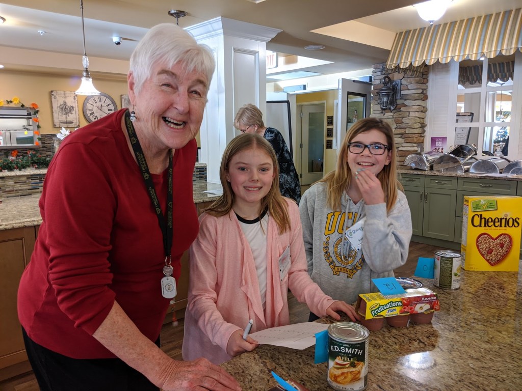 When all of our programs have completed these visits, all of our food items will be dropped off in time for Food Bank volunteers to add these to Christmas hampers.Pictured here are students from St. Theresa Middle School and their linked seniors from Bedford Village.