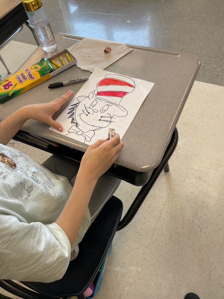Our Volunteer Grandparent shared the story with her assigned classroom and then led the students in drawing portraits of the cat. After the portraits were drawn, students then completed the pictures by using oil pastels.
