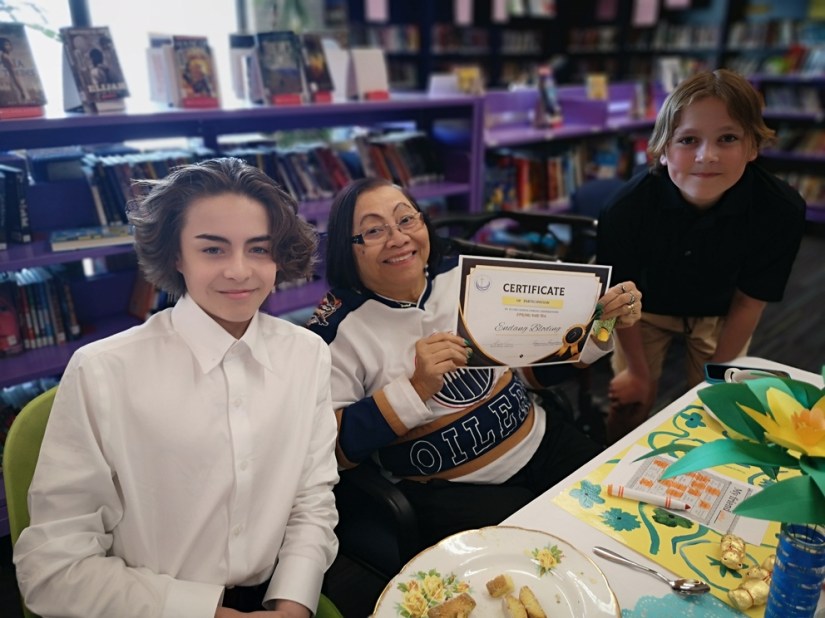 Spring is here and what better way to celebrate it than inviting our Linking Generations seniors from Heartland Housing Clover Bar Lodge to a tea in their honor at our partner school Ecole Our Lady of Perpetual Help School Thursday afternoon. As seniors entered the school, students quickly rose to greet them and usher them into the library, where tables were decorated and set with china from years past and cookies and cake. “I used to have this china pattern”, remarked one senior. as she shared memories with the students on bringing her china out for’ special occasions’.