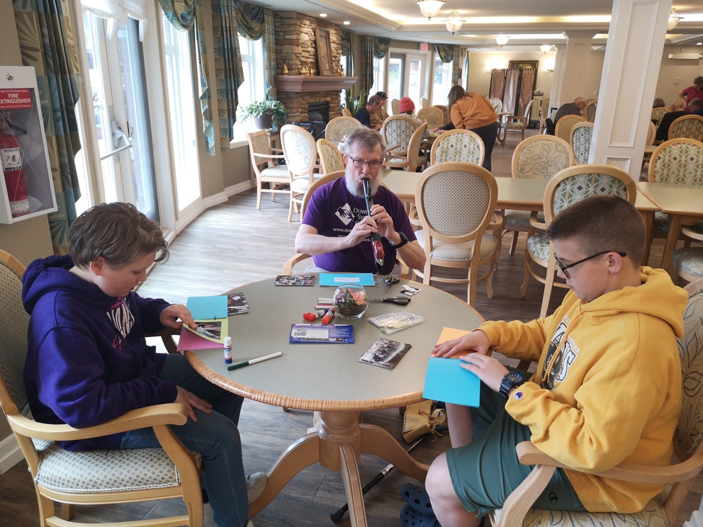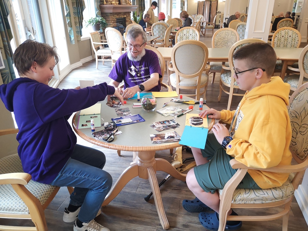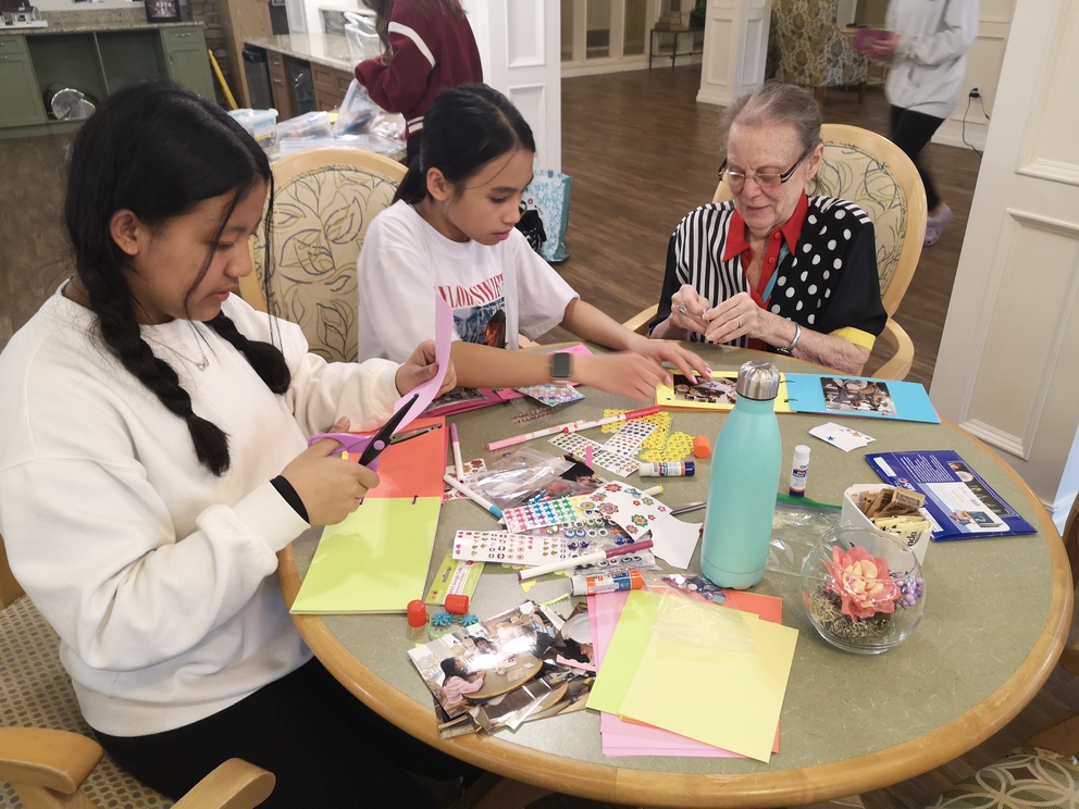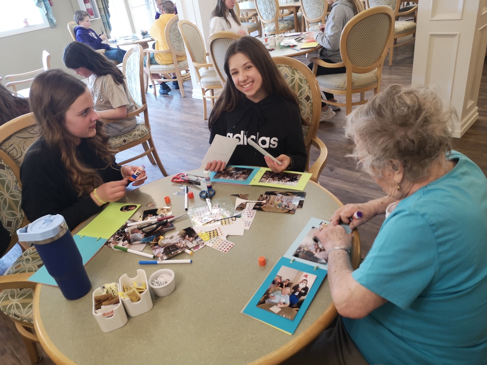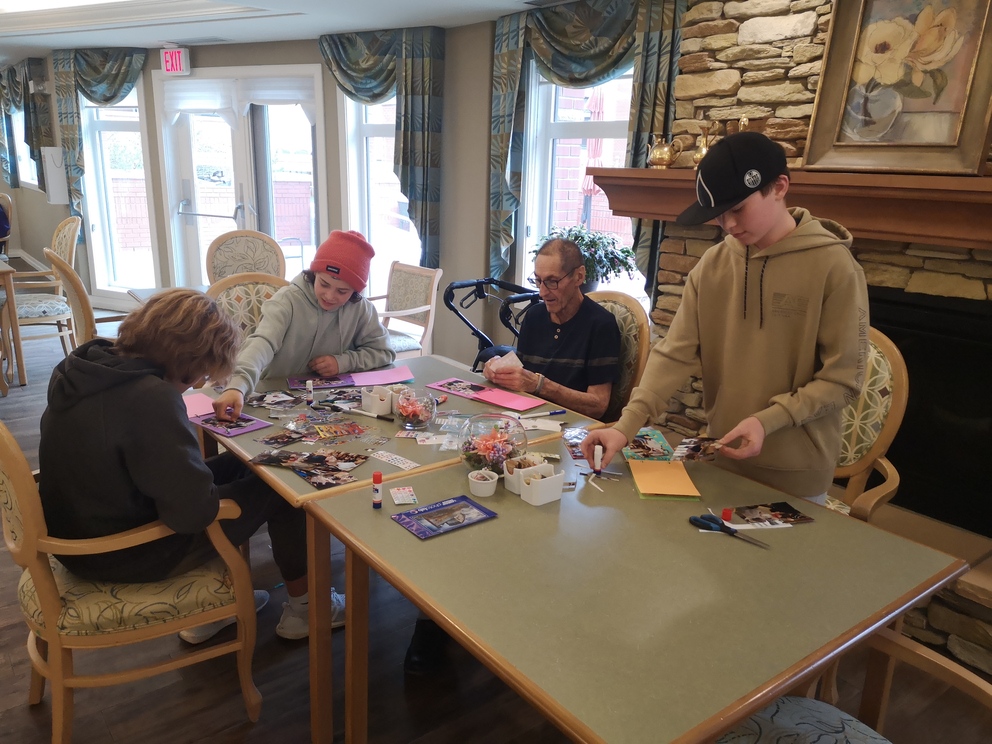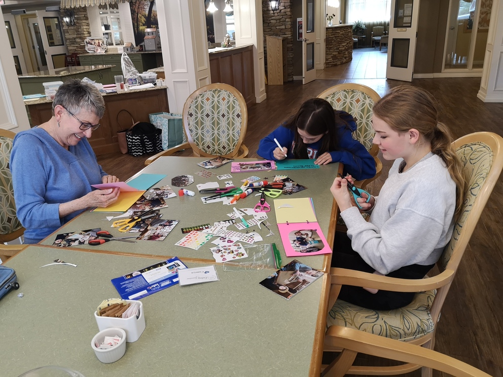 Students from St. Theresa Catholic School and seniors from Christenson Developments Bedford Village make photo albums.