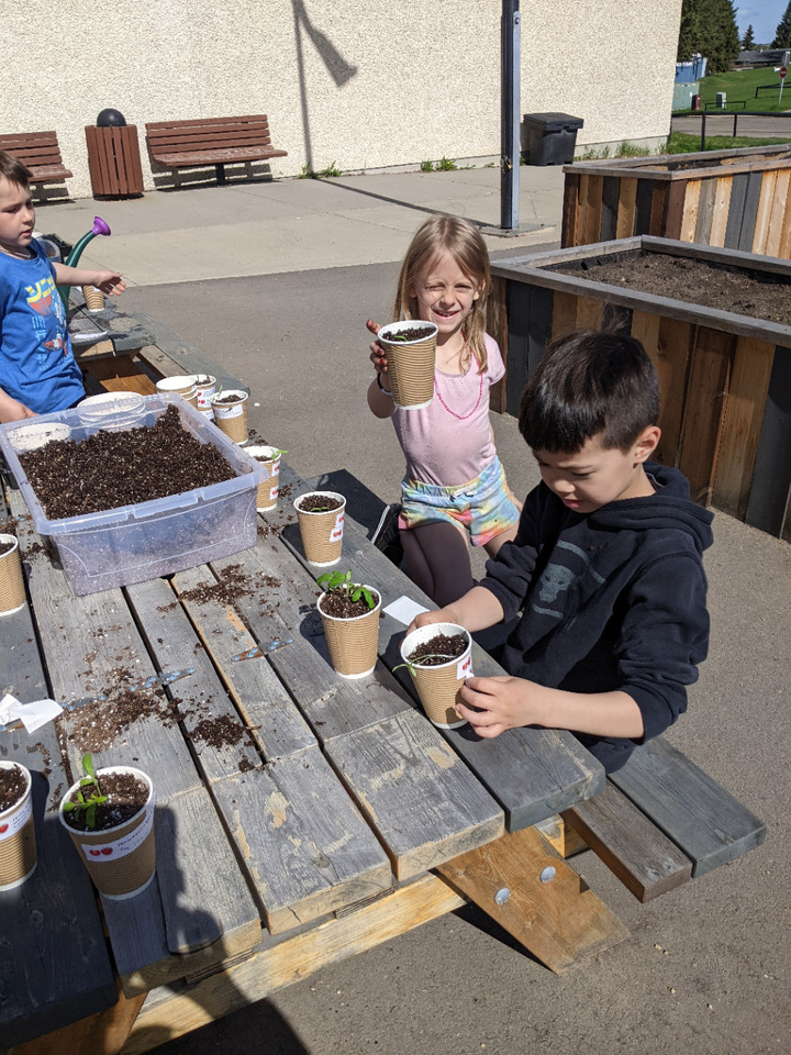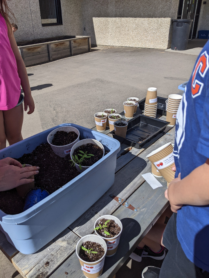 We started these seeds in early April and today we transplanted them into paper cups so the kids could take 2 or 3 plants home and share them. Each student needed to decide who they were going to give their extra plant to. Some students were giving it to their bus driver, some to their grandparents and others were giving it to a neighbor. So not only do they learn where food comes from but they also learn about sharing and doing something kind for someone else.