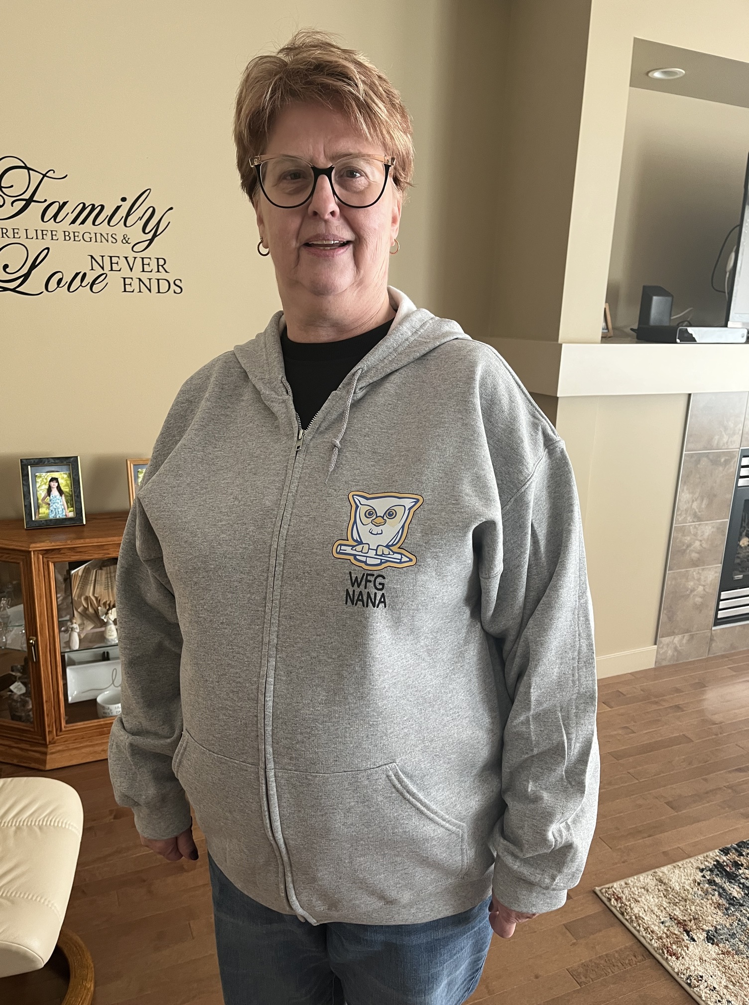 Pictured here is one of our Volunteer Grandparents as she received a hoodie from Win Ferguson Elementary School with her treasured name that the students call her! “Nana”‘.